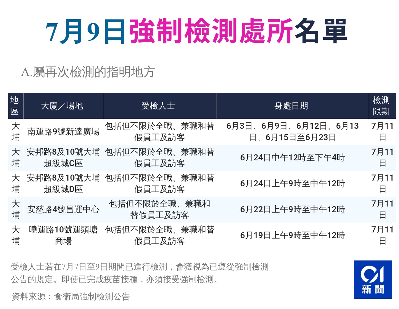 ¬å' Now æ°è from images-news.now.com 曾於6月12日上午11時至下午1時身處又一城 festival grand cinema 超過一小時的人士須接受檢測。. 強制檢測公告(英語: compulsory testing notice )為在2019冠狀病毒病香港疫情中,香港政府應對應疫情而指明屬某類別或描述的人士接受2019冠狀病毒病的檢測。 政府可透過刊憲刊登公告,強制在疫情爆發時於特定處所工作或生活的人、特定職業的人,以及臨近完成強制檢疫的抵港人士,接受病毒檢測。 須於二 二一年七月一日或之前交回已採樣本的檢測樣本收集瓶。受檢人士若 在二 二一年六月二十四日至六月二十六日期間已進行檢測,會獲視為已遵從 強制檢測公告的規定。已經完成2019冠狀病毒病疫苗接種的人士1 會獲視為已 遵從強制檢測公告的規定。 任何在六月二十八日下午五時至下午十時曾身處香港中環皇后大道中 15 號置地廣場香港置地文華東方酒店地下 mo bar 的人士(包括但不限於全職、兼職和替假員工及訪客),須於七月二十三日或之前接受檢測。 任何由政務司司長根據《外國地區到港人士強制檢疫規例》(第 599e 章)的第4(1)條豁免接受強制檢疫,並在二 二一年四月十 四日曾乘搭航班編號cx906 由菲律賓抵港的民航客機的人士,須 於二 二一年四月三十日或之前接受檢測。